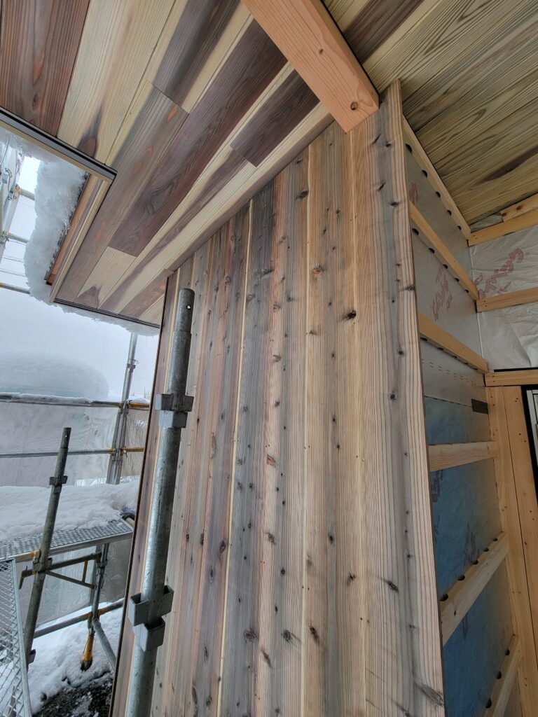 まずは板張り外壁ですが、私たちは杉の無垢材にウッドロングエコという経年変化したような雰囲気が出る天然由来の塗料を塗装しました。