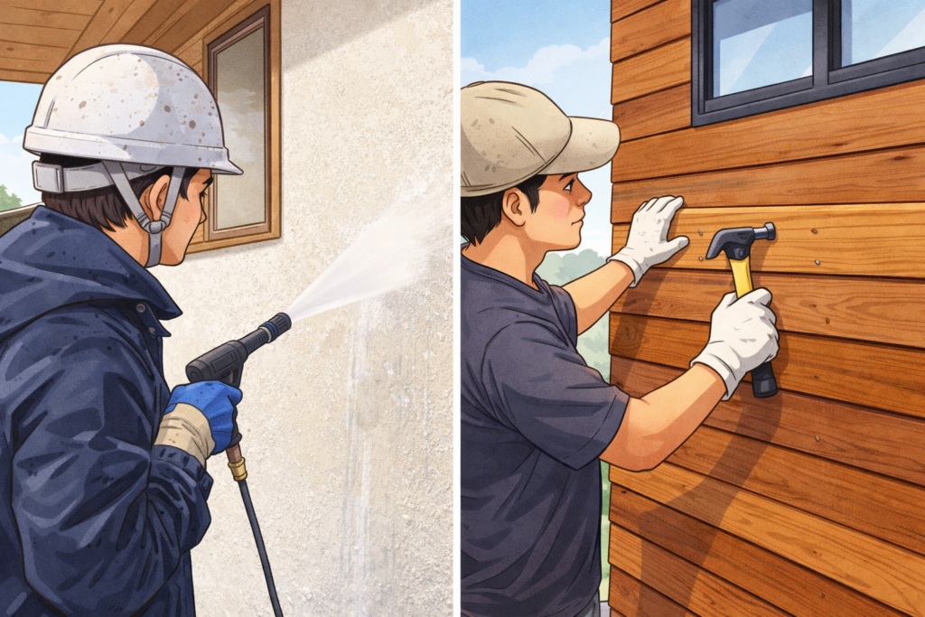 外壁のメンテナンスは、「板張り」と「弾性リシン」で考え方が大きく異なります。