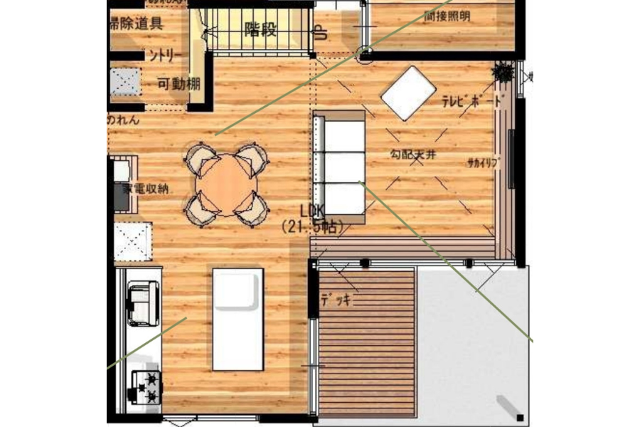 我が家のLDKは 21.5畳のL字型。理想だった一直線のLDKは土地の関係で叶いませんでしたが、その代わりに 移動距離が短く、家族の気配がより近くに感じられる“コンパクトで質の高いLDK” が実現できました。