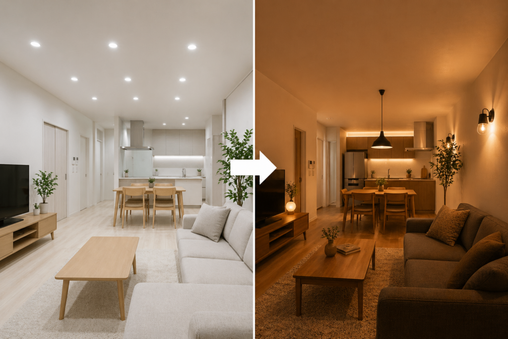 やわらかい光になることで、夜でも落ち着いて過ごせる空間になります。