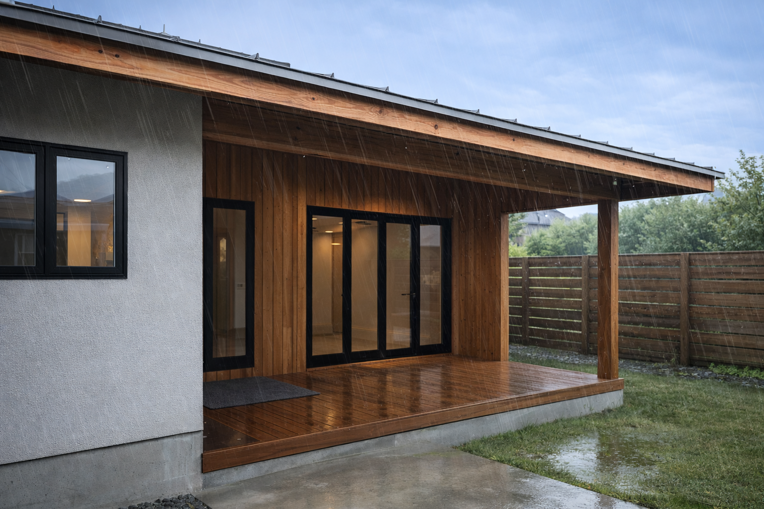 ウッドデッキが雨で濡れにくい=長持ちするという点。