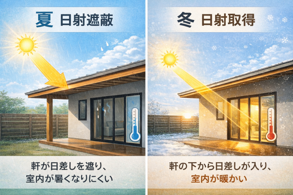 - 夏:太陽高度が高い → 軒が日差しを遮る