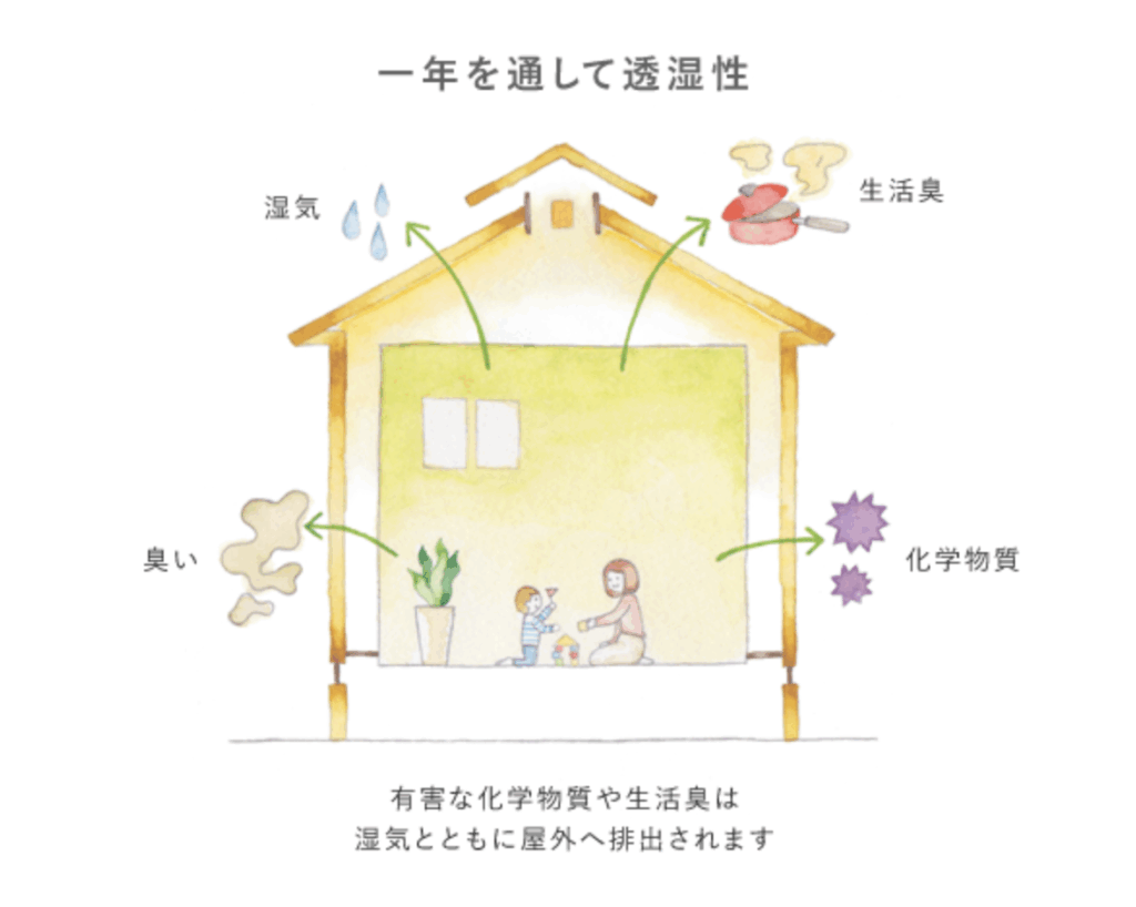• 壁や天井に透湿性のある自然素材(紙クロス・珪藻土・漆喰等)を使用するので科学的な匂いが少なく、空気が綺麗
