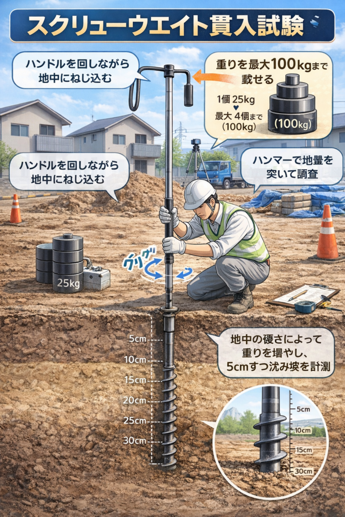 我が家で行われた地盤調査は、「スクリューウエイト貫入試験(SWS試験)」です。