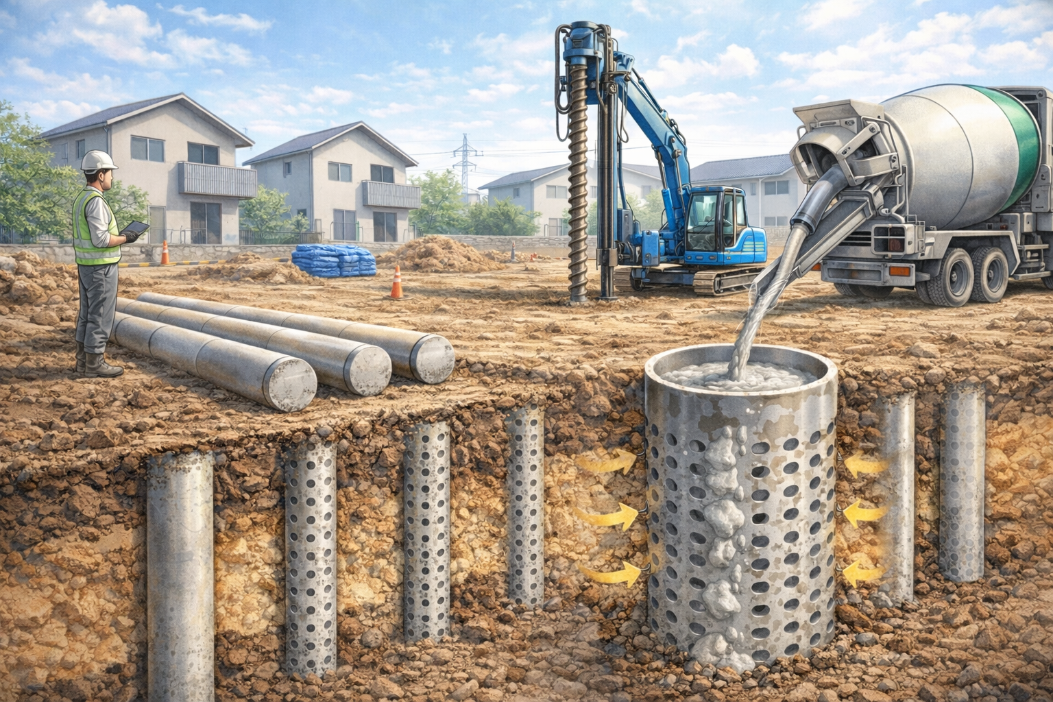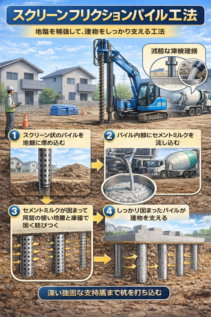 今回採用したのは、「スクリーンフリクションパイル工法」という柱状改良工法です。