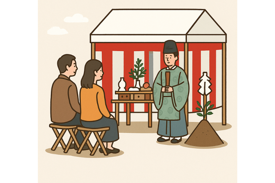 神主を招き、祝詞を奏上し、お供え物をしたり、神職や施主が鍬(くわ)や鋤(すき)で土地に最初の印をつける「鍬入れの儀」を行います。必ず行う義務はなく、地域や個人の考えによって実施するかどうかを決めます。